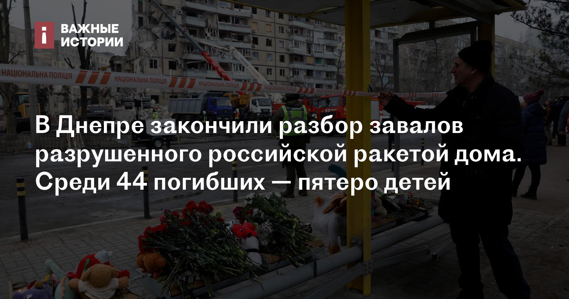 В Днепре закончили разбор завалов разрушенного российской ракетой дома. Среди 44 погибших — пятеро детей