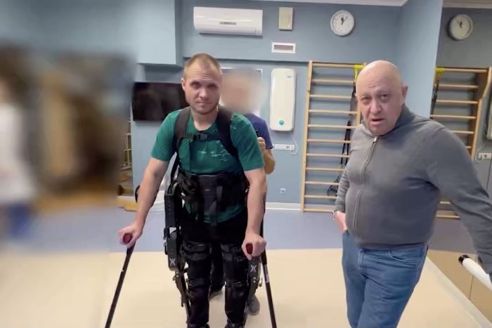 На видео Пригожин общается с наемником, который восстанавливается после ранения: он использует экзоскелет, снижающий нагрузку на ноги и нижний отдел позвоночника.