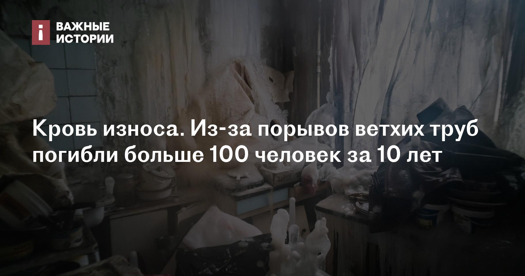 104человекапогибли и 310 получили ожоги из-за аварий на изношенных тепловых сетях за последние 10 лет (только случаи, попавшие в СМИ)Если сложить эти цифры, всего за последние 10 лет из-за порывов ветхих труб с кипятком в России погибли 104 человека и 310 получили травмы. Это минимальная оценка, поскольку она включает только случаи, которые попали в СМИ.