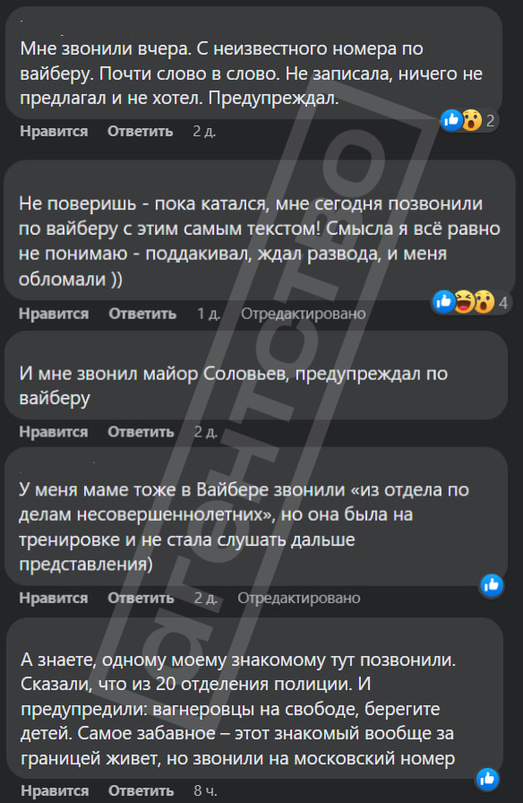 Детали. Все, кому звонили, судя по их профилям в соцсетях, жили или живут в столичном регионе. Звонки были примерно одинакового содержания: звонившие представлялись сотрудниками полиции, предупреждали о том, что на свободу вышли бойцы «ЧВК Вагнера», и призывали поговорить по этому поводу с детьми, быть осторожнее и не отпускать их одних после семи вечера.