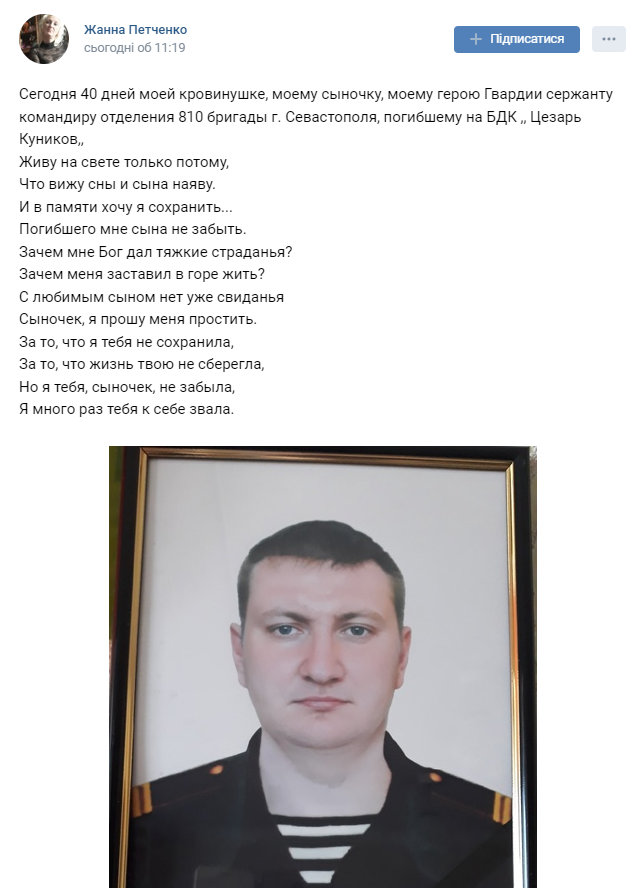 Крым.Реалии удалось разыскать некролог погибшего на «Цезаре Куникове» – командира отделения 810-й бригады Евгения Петченко из Брянки Луганской области. О месте гибели написала его мать.