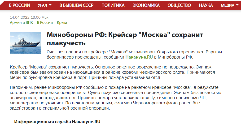 Уничтожение "Москвы" стало самой дорогой финансовой потерей флота и вызвало острую реакцию в России.