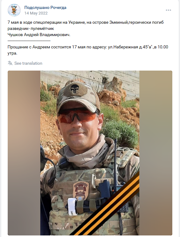 Также были похоронены разведчики-снайперы из Севастополя Никита Максименко и Дмитрий Островский. Разведчик-пулеметчик Андрей Чушков был родом из поселка Рочегда Архангельской области России. 19 января 2023 года на здании местной школы установили мемориальную доску.