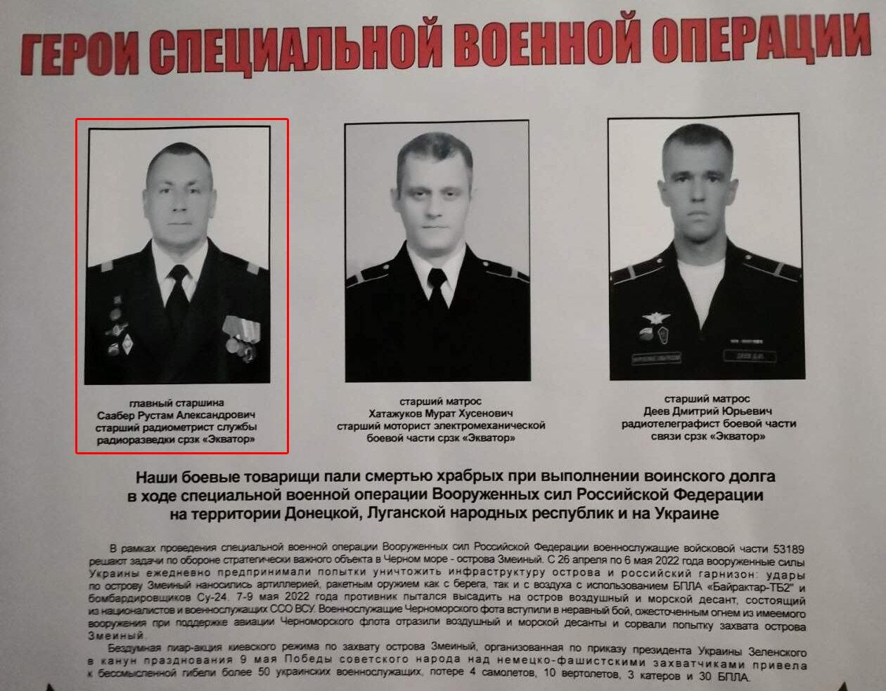 Российские военные погибли и в боях за остров Змеиный. 2 мая украинские военные сообщили, что у острова Змеиный уничтожили два российских катера типа «Раптор». Затем сообщалось, что «Байрактар» уничтожил российский десантный корабль типа «Серна» и два зенитных ракетных комплекса «Тор» возле Змеиного.