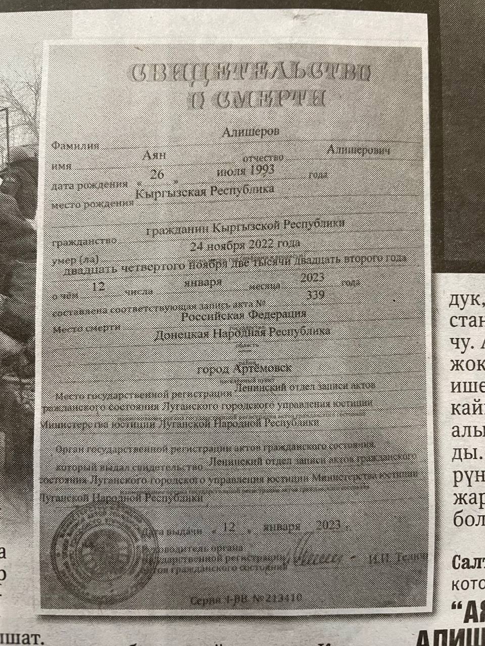 Кыргызстанец Аян Алишеров , осужденный в России погиб в зоне боевых действий в Украине. Об этом пишет издание "Kloop" со ссылкой на газету "Супер Инфо". Брат погибшего утверждает, что Абдалиев до своей смерти говорил о ЧВК "Вагнер".
