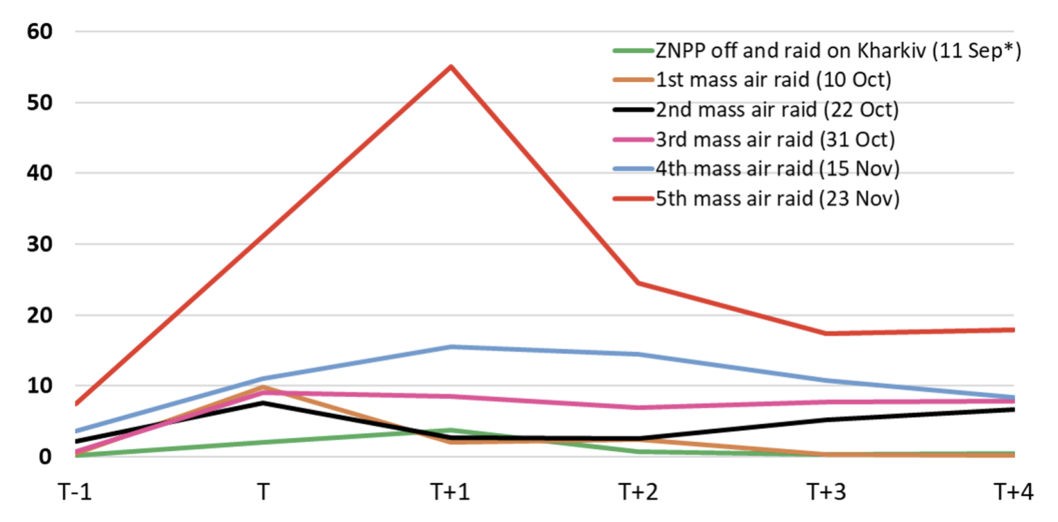 Примечание: *Поскольку рейд на Харьковские электросети произошел вечером, дата Т здесь 12 сентября, ZNPP off — это отключение Запорожской АЭС. Во всех остальных случаях Т соответствует дате, указанной в легенде. Источник: Расчеты авторов на основе данных банкоматов коммерческих банков.