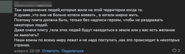 Новость о сносе мемориала финским военным также опубликовали в группе «Интересный Приморск» во «ВКонтакте». В комментариях под постом местные жители согласились со словами Скока об исправлении надписей на табличках.