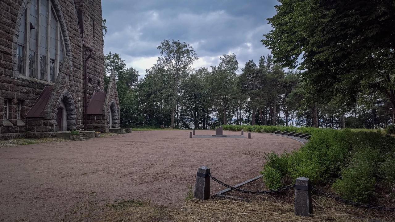 Сейчас "Крест и парус" стоит с другой стороны кирхи – в 2019 году его переместили, чтобы над могилами сделать мемориальный комплекс – небольшие гранитные стелы с именами погибших.