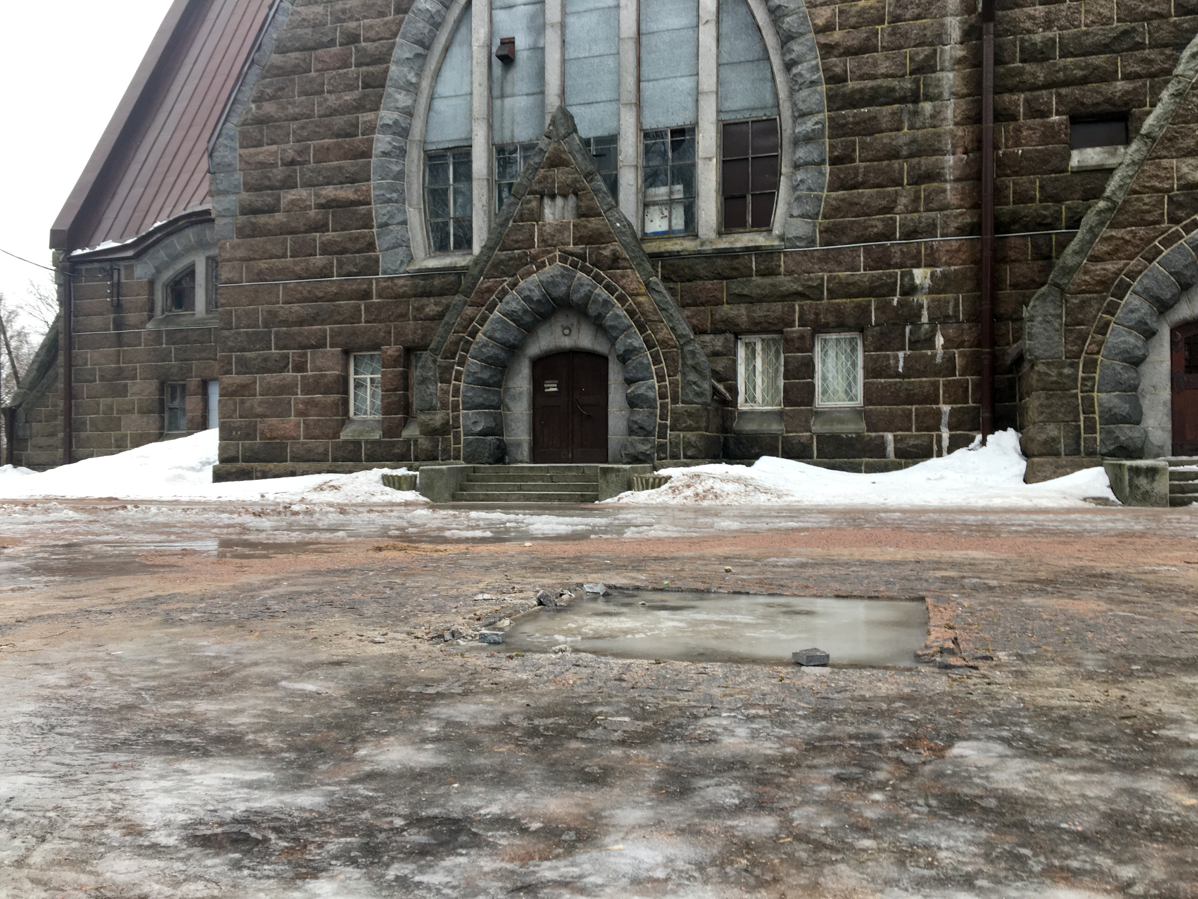 При въезде в Приморск асфальтовая дорога будто заканчивается – сплошь ямы и ледяные надолбы. На тротуарах и возле кирхи св. Марии Магдалины, где был установлен мемориал, сплошной лед. Место, где находился памятник, легко угадывается по пустому квадрату земли в центре мощеной площадки.