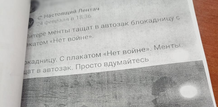 Детали. В публикации «Лентача» было написано: «В Питере менты тащат в автозак блокадницу с плакатом „Нет войне“. Блокадницу. С плакатом „Нет войне“. Менты тащат в автозак. Просто вдумайтесь».