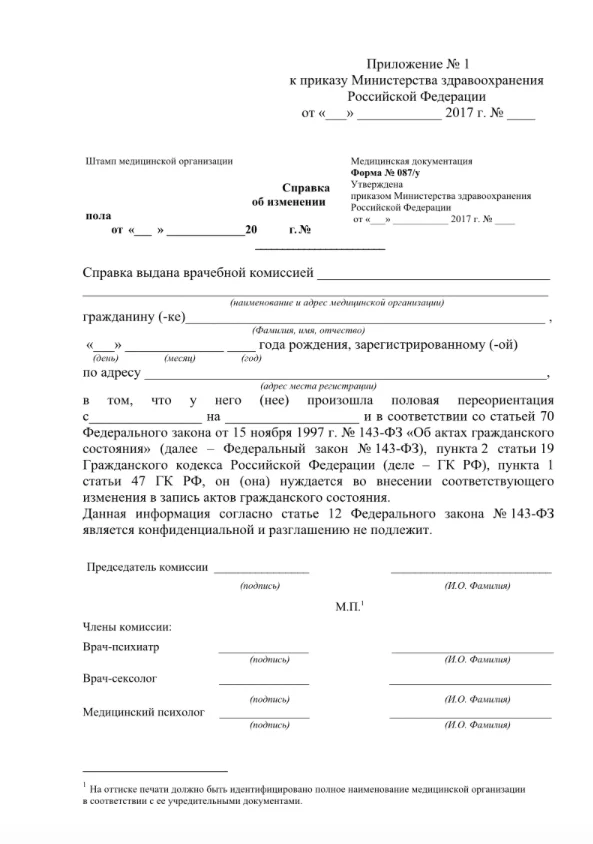 В России для того, чтобы получить возможность поменять гендерный маркер в документах, необходимо пройти специальную комиссию из трех врачей — клинического психолога, психиатра и сексолога — и получить соответствующую справку по форме 087/у (формально она называется справкой об изменении пола). Далее с этой справкой можно отправляться в ЗАГС, получать новое свидетельство о рождении, а вслед за ним — и все остальные документы.