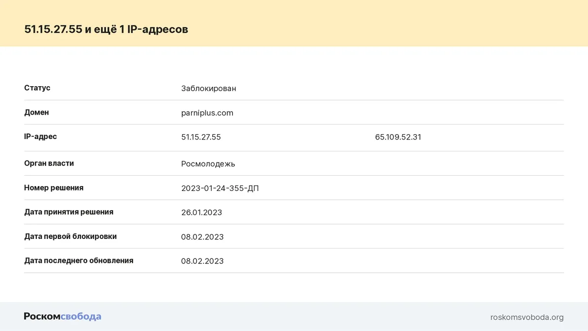 «С целью пресечения противоправной деятельности были направлены ряд обращений в соответствующие контролирующие и правоохранительные органы. В результате быстрее всего отреагировала Росмолодежь, которая своим решением от 26 января внесла сайт "Парни+" в Единый реестр запрещенных сайтов, фактическая блокировка на территории России произошла сегодня», — говорится на странице «Гражданского общества».