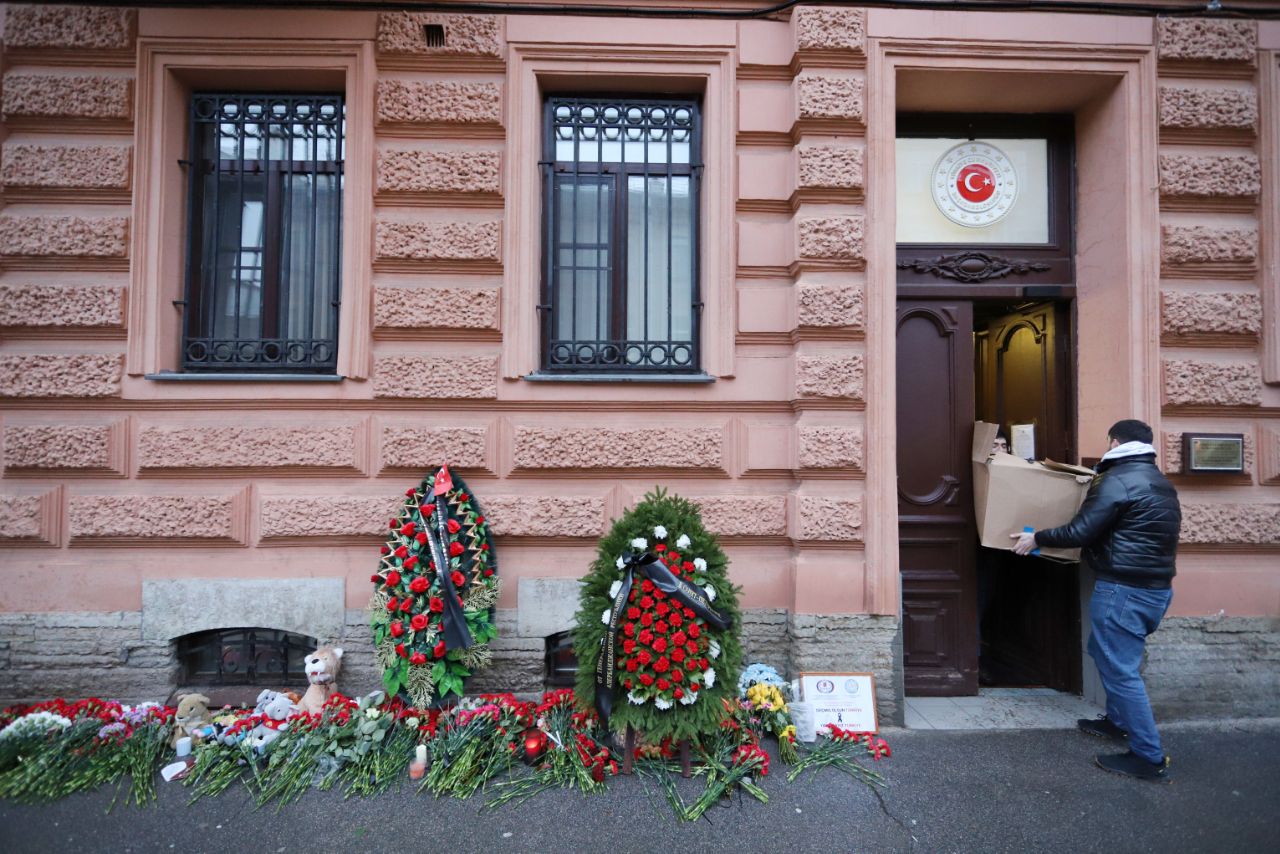 Петербуржцы несут цветы к консульству Турции на 7-й Советской улице в знак поддержки пострадавшим от землетрясения.