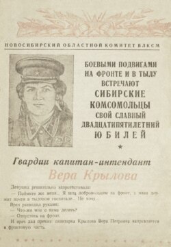 В Новосибирске тоже держали фронтовой путь землячки в поле зрения. В 1943 году по следам статьи из "Комсомольской правды" обком ВЛКСМ выпустил листовку "Боевыми подвигами на фронте и в тылу встречают сибирские комсомольцы свой славный двадцатипятилетний юбилей", где в самых ярких тонах описаны действия гвардии капитана-интенданта Веры Крыловой. "В школе-десятилетке Татарского района ребята вспоминают свою "географичку" и гордая улыбка светится на их лицах: Наша! Героиня! Комсомолка!"
