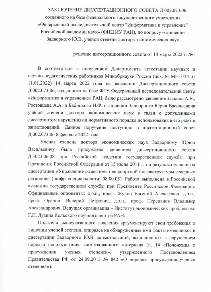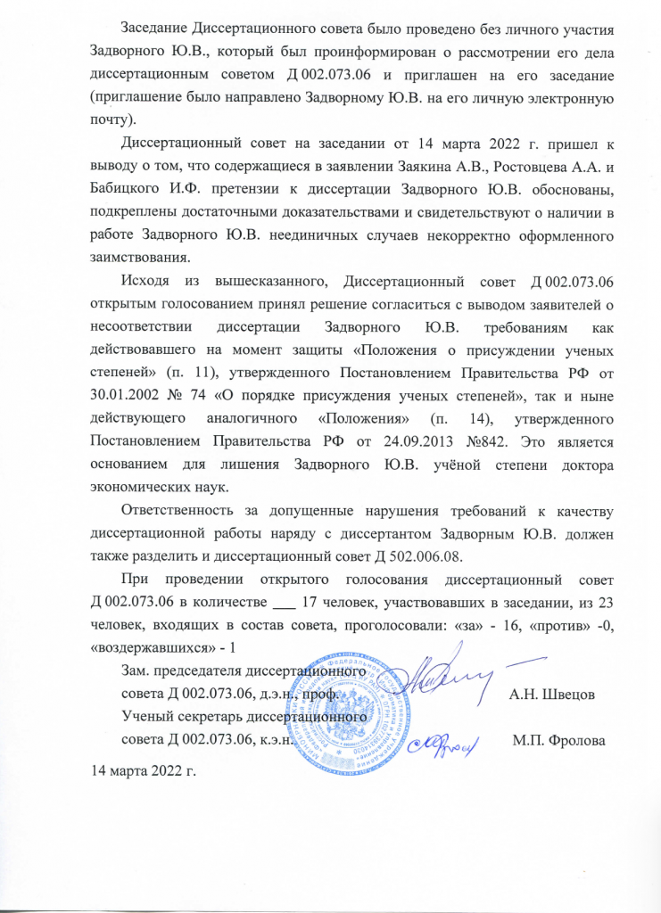 Замечательный человек. Вот только диссертацию он списал. Это обнаружило сообщество ученых «Диссернет». В 2022 году Задворного докторской степени лишили. Таким образом, у Задворного нет настоящей учёной степени, но остались три рыболовные компании.