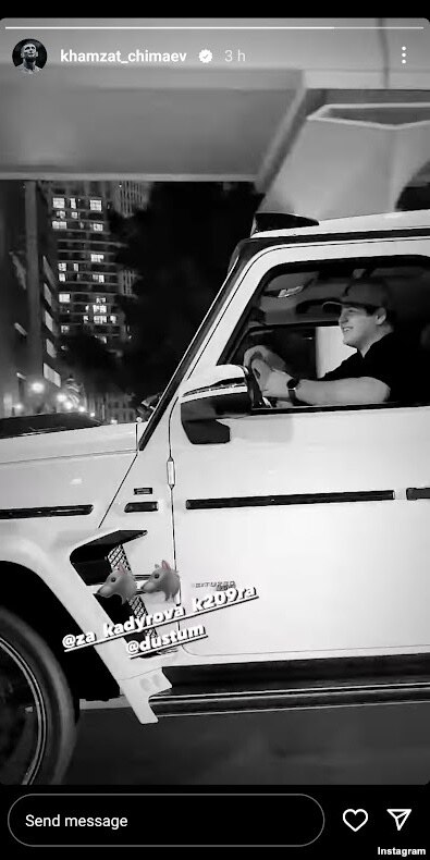 Видео с Эли Кадыровым, Адамом Кадыровым и чеченским спортсменом, гражданином Швеции Хамзатом Чимаевым, едущими за рулем трех разных автомобилей, 10 февраля опубликовал сам Чимаев в сториз в своем инстаграме. О том, что видео снято в Дубае, говорит арабский шрифт на номерном знаке одной из машин, а также другие недавние публикации в инстаграме Чимаева и сториз в инстаграме Эли Кадырова.