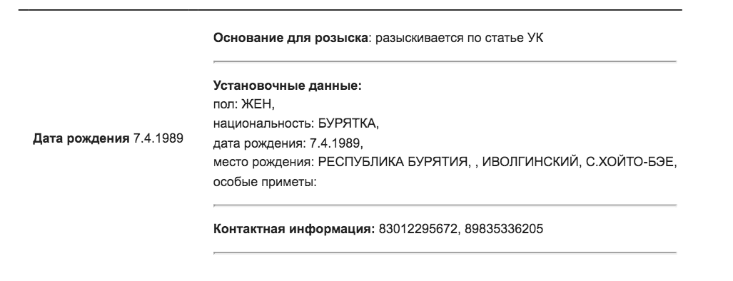 Согласно карточке, активистку разыскивают по уголовному делу, конкретная статья там не указана.