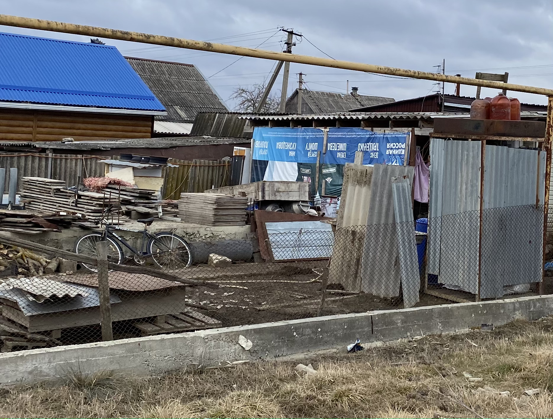 Бакинское кладбище расположено прямо на въезде в станицу, возле него раз в час останавливаются автобусы. Через дорогу стоят покосившиеся деревянные хатки и старые сараи, один из которых затянут висящим вверх ногами баннером "Единой России". Возле знакомых фамилий – Шойгу, Лавров, Проценко – расхаживают куры и пасутся коровы.