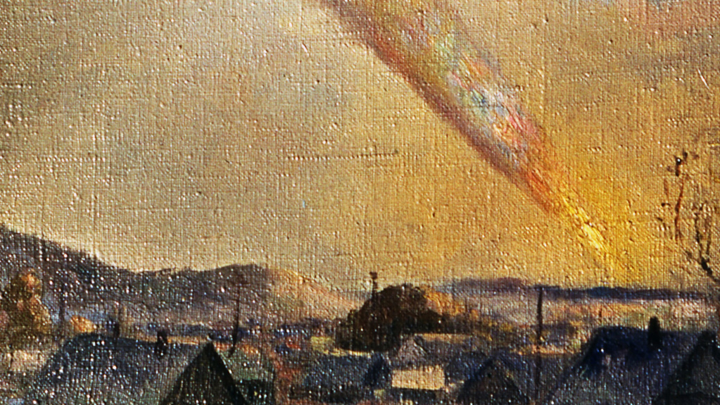 В 1957 году, в честь 10-летия его падения, в СССР вышла даже марка, изображающая этот величественный момент. Маленький заснеженный поселок, крыши домов, а над ними – гигантская, замазавшая собой половину неба, "морковка" – след космического пришельца. Репродукция картины, нарисованной одним из очевидцев в 1947 году. Холст, масло.