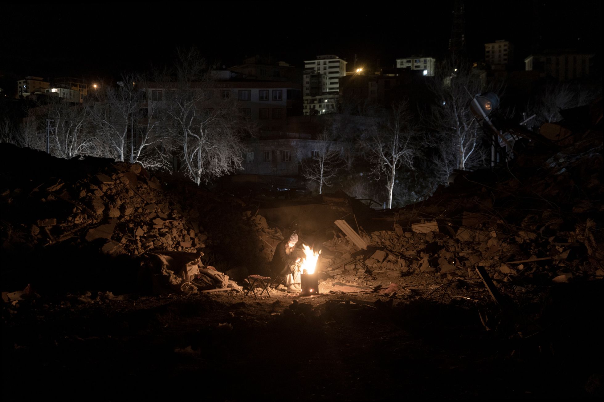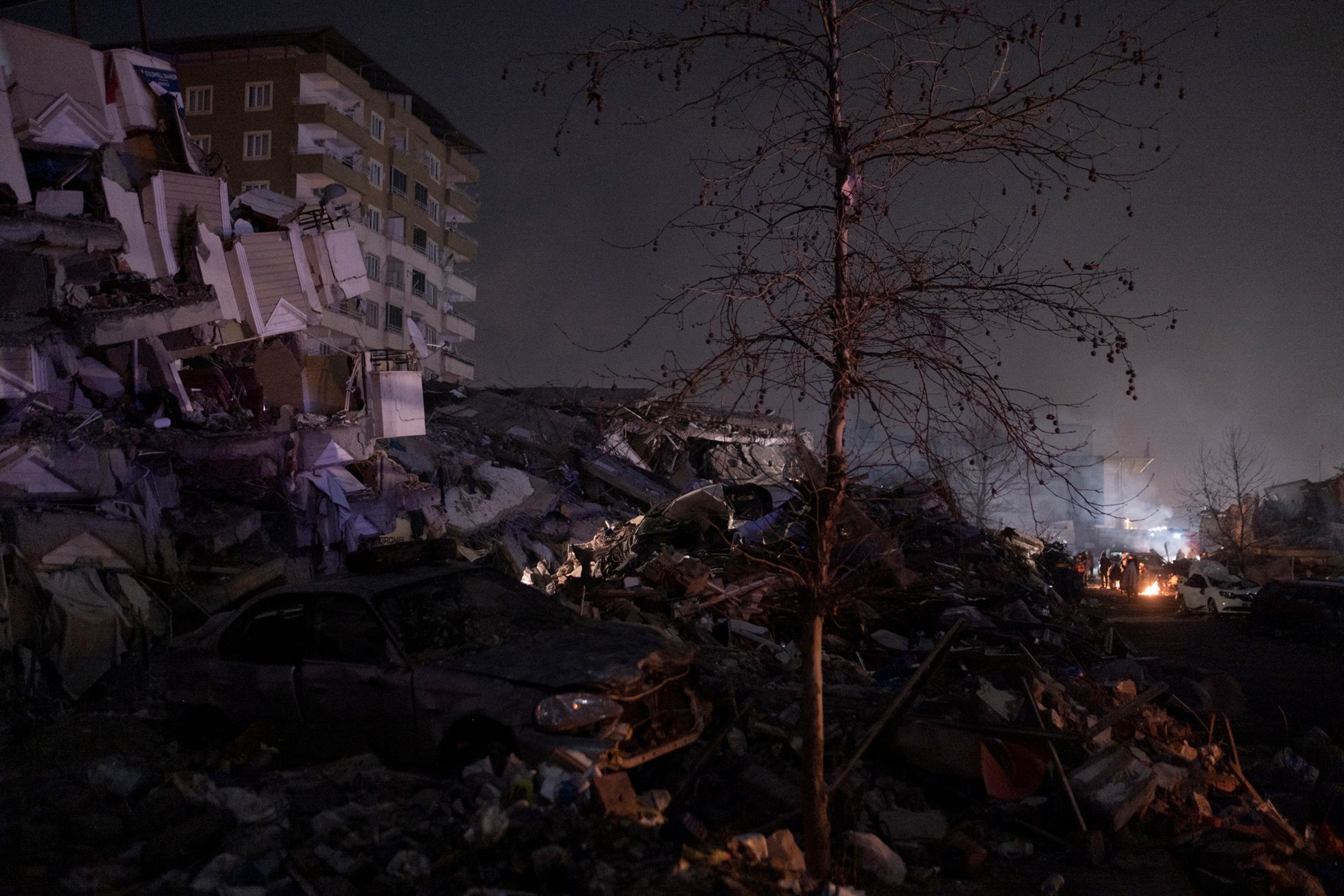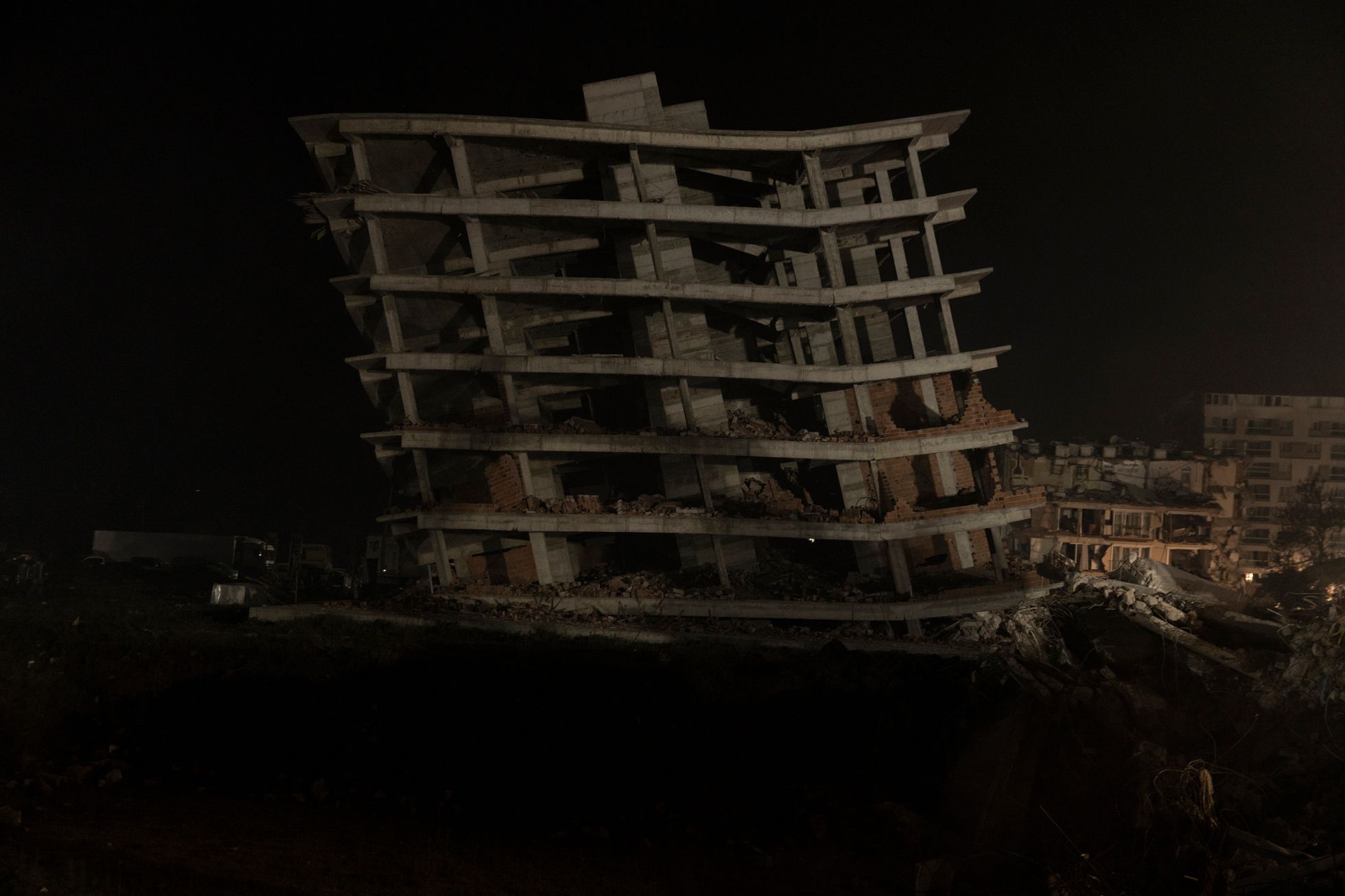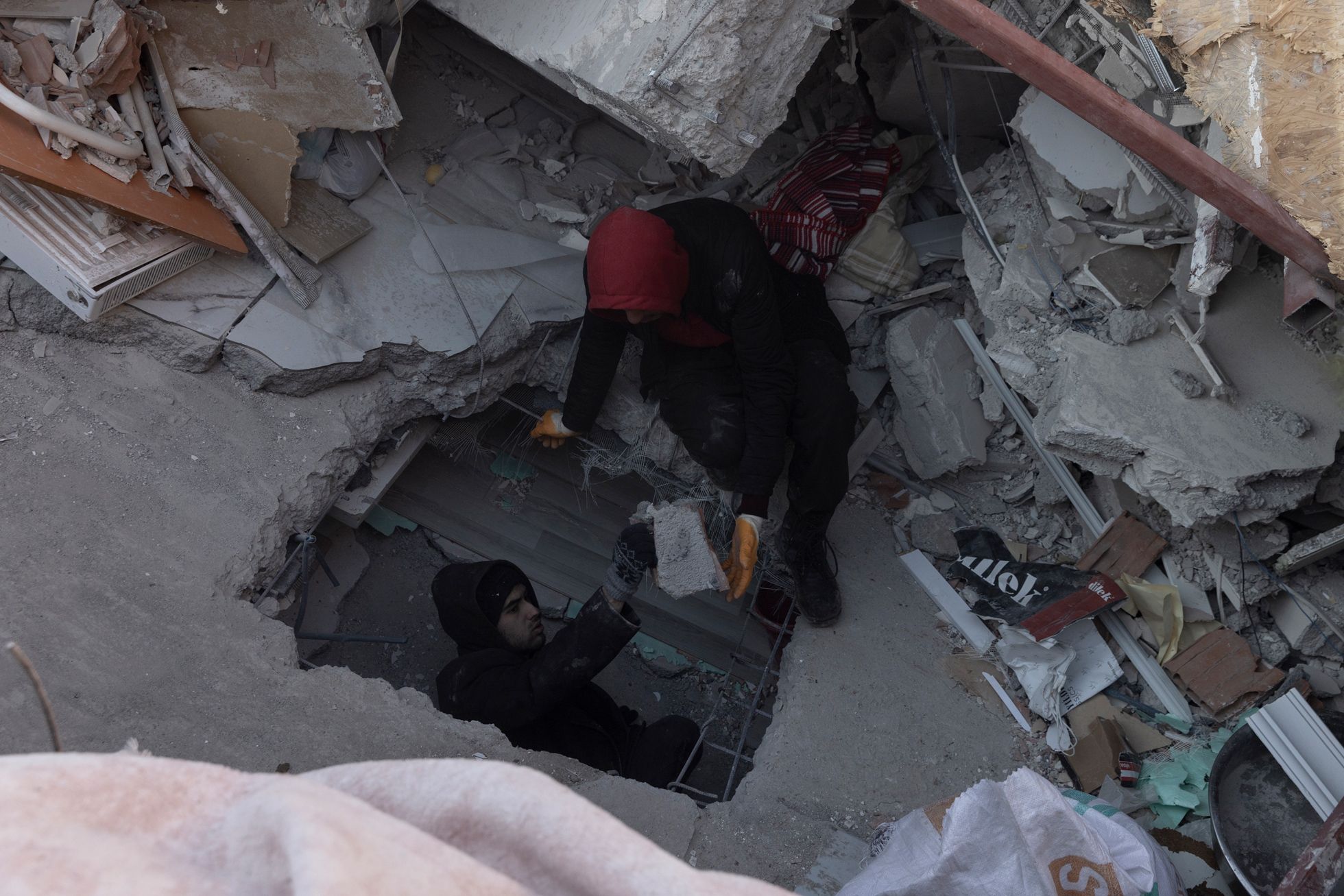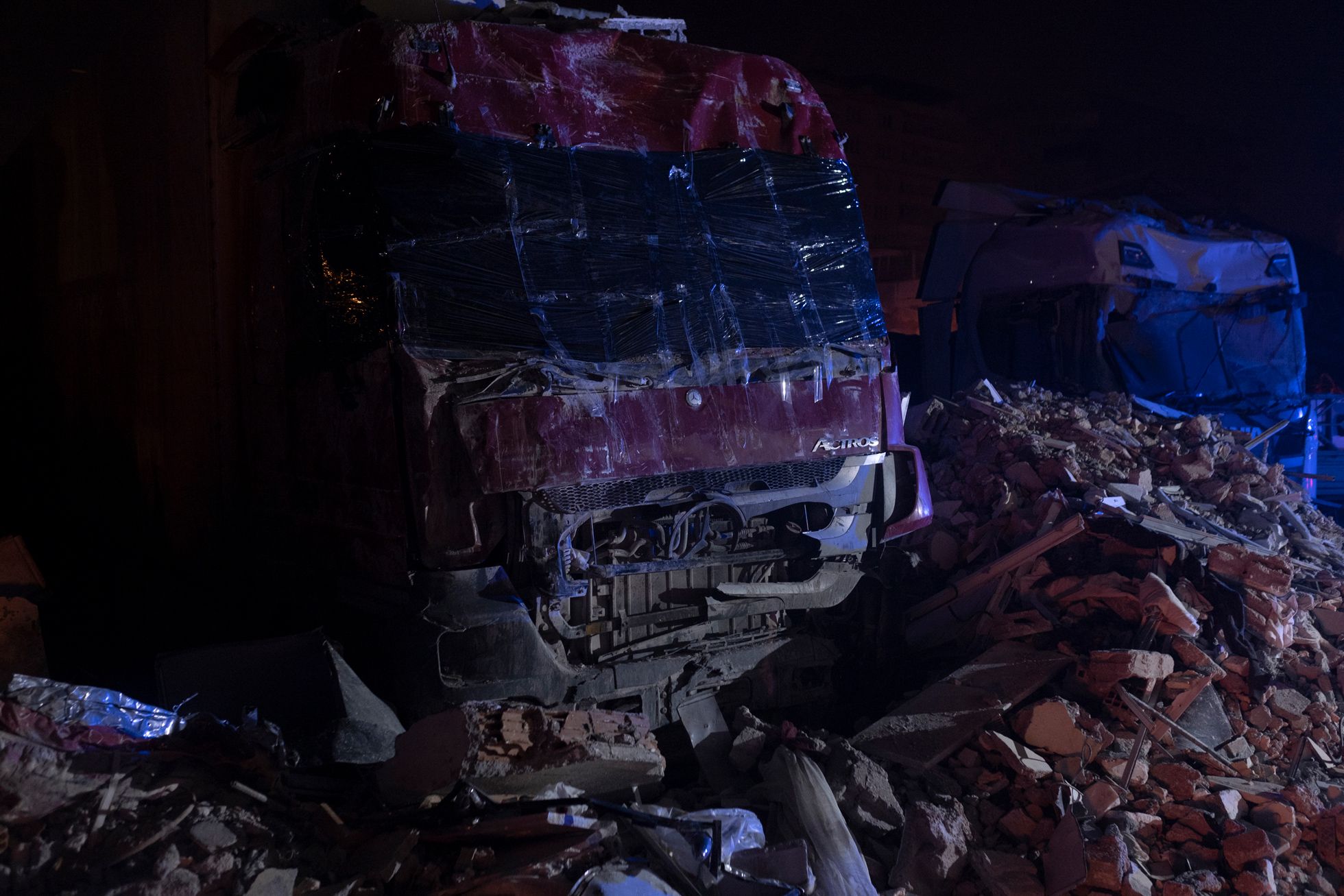 Дальше я поехал в Кахраманмараш — город, который был почти полностью разрушен вторым землетрясением, произошедшим примерно в час дня (первые толчки были около четырех часов утра 6 февраля, — прим. «Медузы»).Я приехал часа в два ночи. Люди жгут костры. Луна очень низко. Как будто цивилизации тут и не было. Какой-то апокалипсис.Я ходил между развалинами и время от времени грелся с местными у костров.Груды обломков вместо домов. В здания не зайти — можно только забраться на них, как на горы.Вся дорога до Кахраманмараша была в разломах — таких больших, что казалось, колеса машины точно в них застрянут.Экскаваторы работают круглые сутки — ищут выживших. В какой-то момент спасатели услышали из-под завалов стуки — там были мужчина и женщина. Их вытаскивали около восьми часов — я все это время там простоял. Обоих удалось спасти, но у мужчины в ноге застрял железный прут, и врачам пришлось прямо на месте лазером ампутировать ему ногу. Вытянули в итоге обоих, но их закрыли одеялами: они были в очень плохом состоянии. Их лиц я так и не увидел.С рассветом в полуразрушенные здания вокруг стали приходить родственники тех, кто мог быть все еще жив под завалами.Начался крик: люди переживали, что чьих-то родственников достают, а чьих-то — нет. Спасатели пытались объяснить, что если начать разгребать один дом с разных сторон, то он может осесть и всех засыпать.Но многие не понимали — начались драки, обмороки, проклятия и плач.Жители сами ходили по развалинам: вслушивались в стуки, кричали в дыры, звали своих близких.Были и те, кто просто обреченно сидел. Потому что больше нет дома: еще вчера ты что-то планировал — а сегодня ничего не осталось.