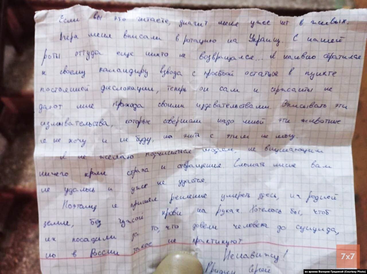 "Если вы это читаете, значит, меня уже нет в живых. Вчера меня вписали в ротацию на Украину. С нашей роты оттуда еще никто не возвращался… Я наивно обратился к своему командиру взвода с просьбой остаться в пункте постоянной дислокации, теперь он сам и сержанты не дают мне прохода своими издевательствами. Описывать эти измывательства, которые совершали надо мной эти животные я не хочу и не буду, но жить с этим не могу, – говорится в тексте записки, авторство которой приписывают 20-летнему Сергею Гридину. – Я не желаю подчиняться людям, не внушающим ничего кроме страха и отвращения. Сломать вам меня не удалось и уже не удастся. Поэтому я принял решение умереть здесь, на родной земле, без чужой крови на руках. Хотелось бы, чтоб их посадили за то, что довели человека до суицида, но в России такое не практикуют. Ненавижу! Гридин Сергей".