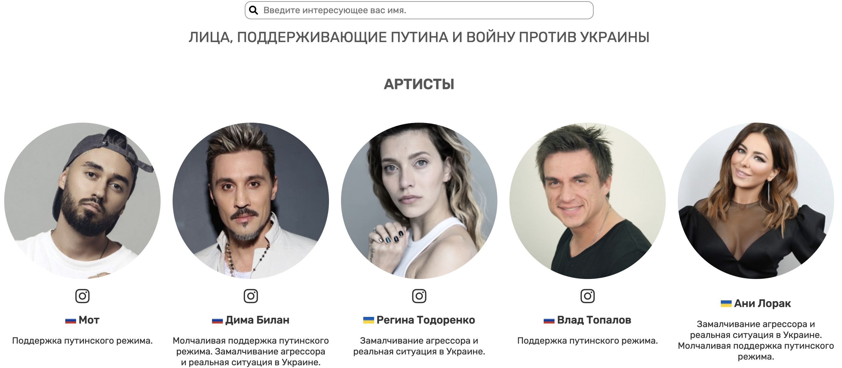 В Украине же запустили сайт theylovewar.com, где можно найти информацию обо всех звездах и публичных лицах, которые поддерживают вторжение в Украину.