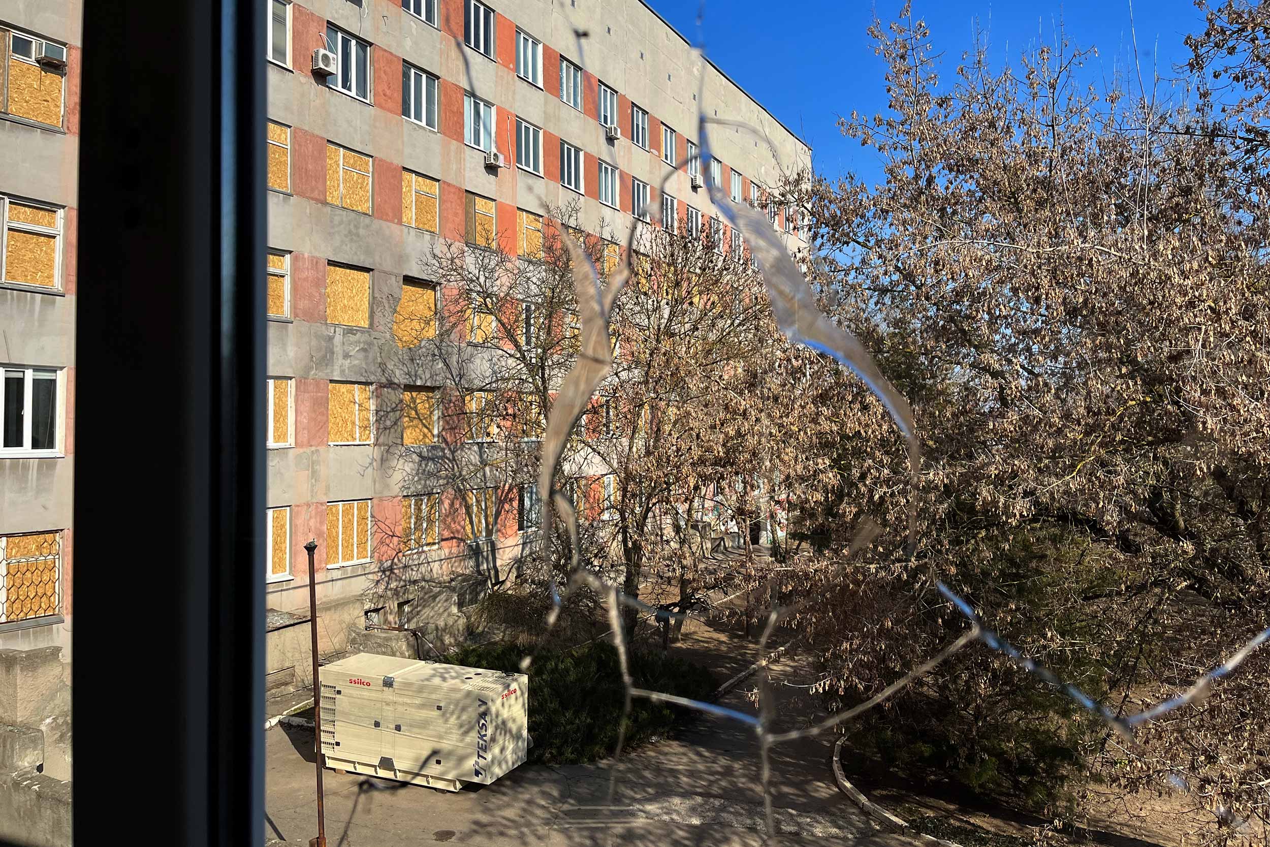 31 декабря 2022 года в Херсонскую детскую больницу попало полдюжины снарядов, и она не могла продолжать функционировать. Большинство окон были либо выбиты взрывами, либо повреждены и в настоящее время закрыты фанерными щитами. Фото: Энтони Борден/IWPR