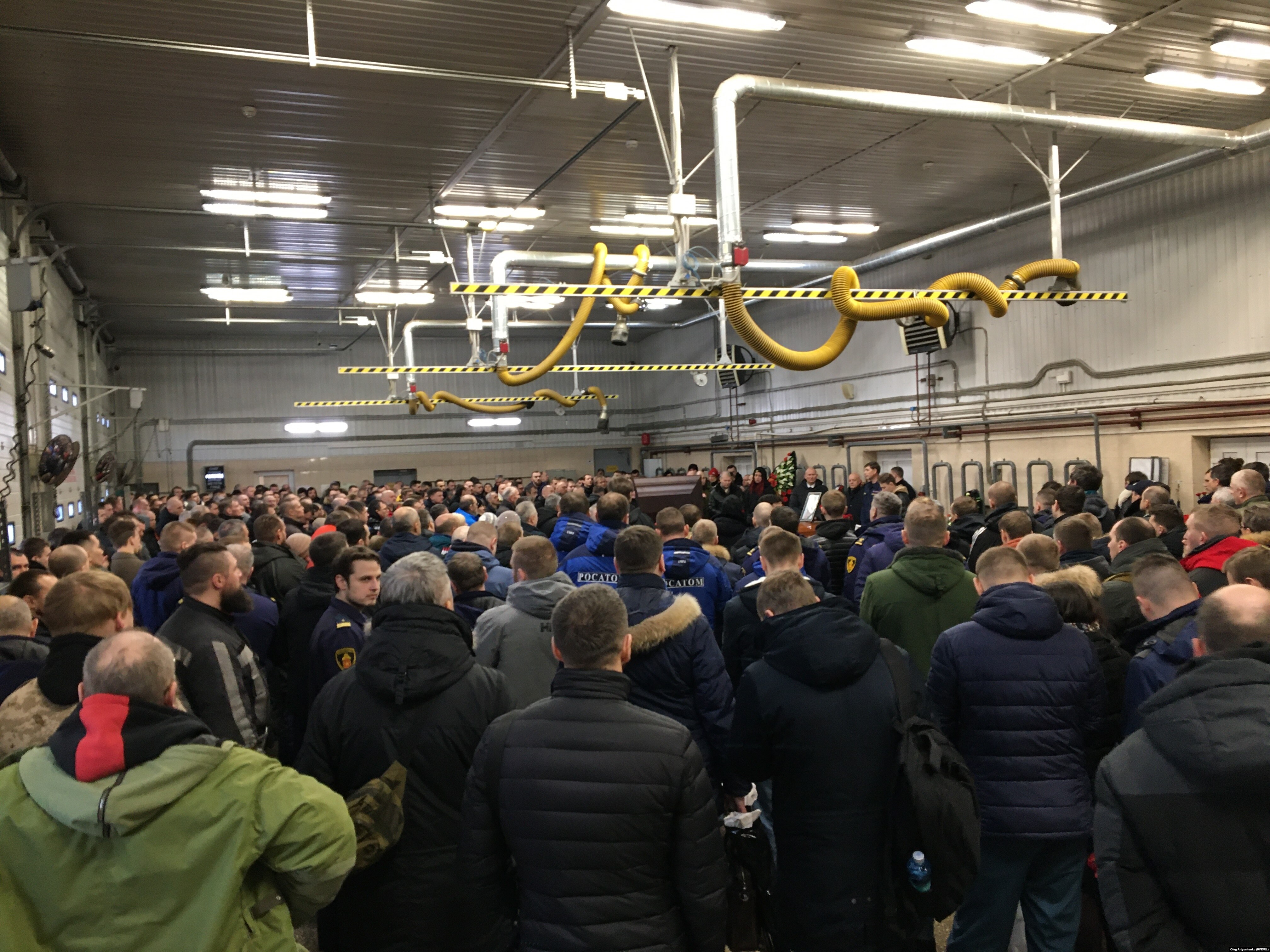 Гробы стояли в гараже для пожарных машин, сами машины ждали на улице. По примерным подсчетам, внутри было не меньше ста пятидесяти человек, еще десятка два стояли на улице. Гроб Рахова был открыт, а Ковалишина – закрыт.