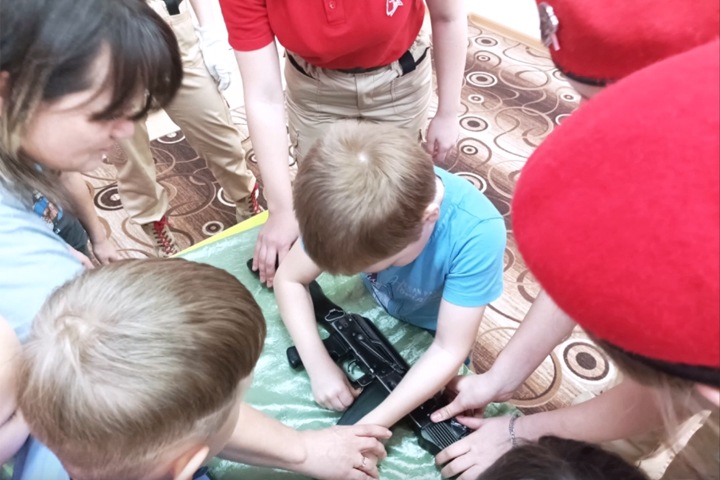 14 февраля воспитанников детсада «Планета детства» из города Уяр Красноярского края навестили девушки из отряда юнармии и начальник местного отделения движения Николай Тюльков. Для детей они провели открытое занятие по строевой подготовке, а также учили их разбирать и собирать автомат.
