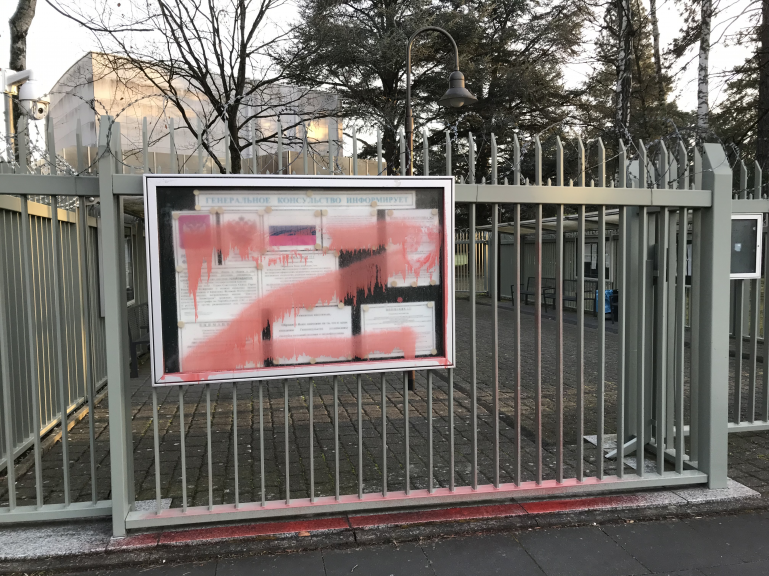 В ночь на 22 февраля ограду, стенд и почтовый ящик генерального консульства России в немецком городе Бонн облили красной краской и исписали буквами Z, сообщается на сайте представительства.
