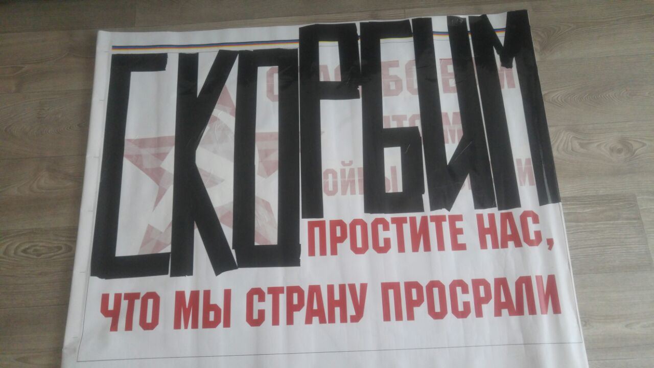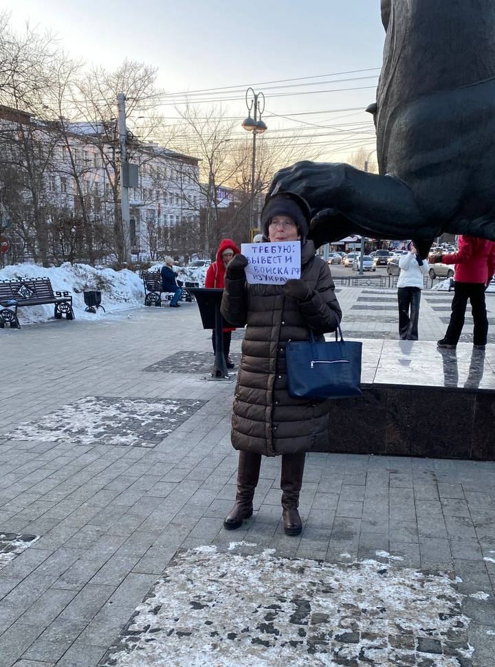 В Комсомольске-на-Амуре на площади Ленина задержали через пять минут. Она вышла на антивоенный пикет с плакатом "СКОРБИМ. Простите нас, что мы страну просрали".