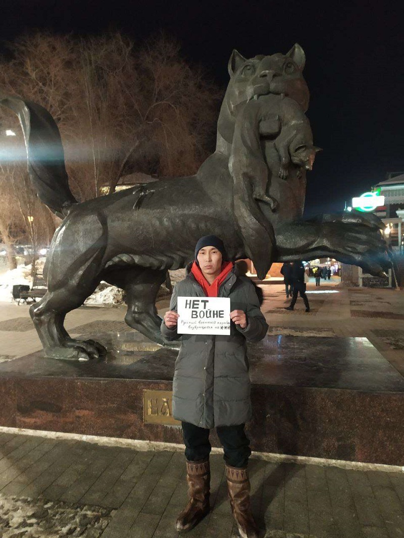 В Иркутске задержали местного жителя Александра Занданова, который стоял с плакатом "Нет войне. Русский военный корабль, возвращайся на ***".