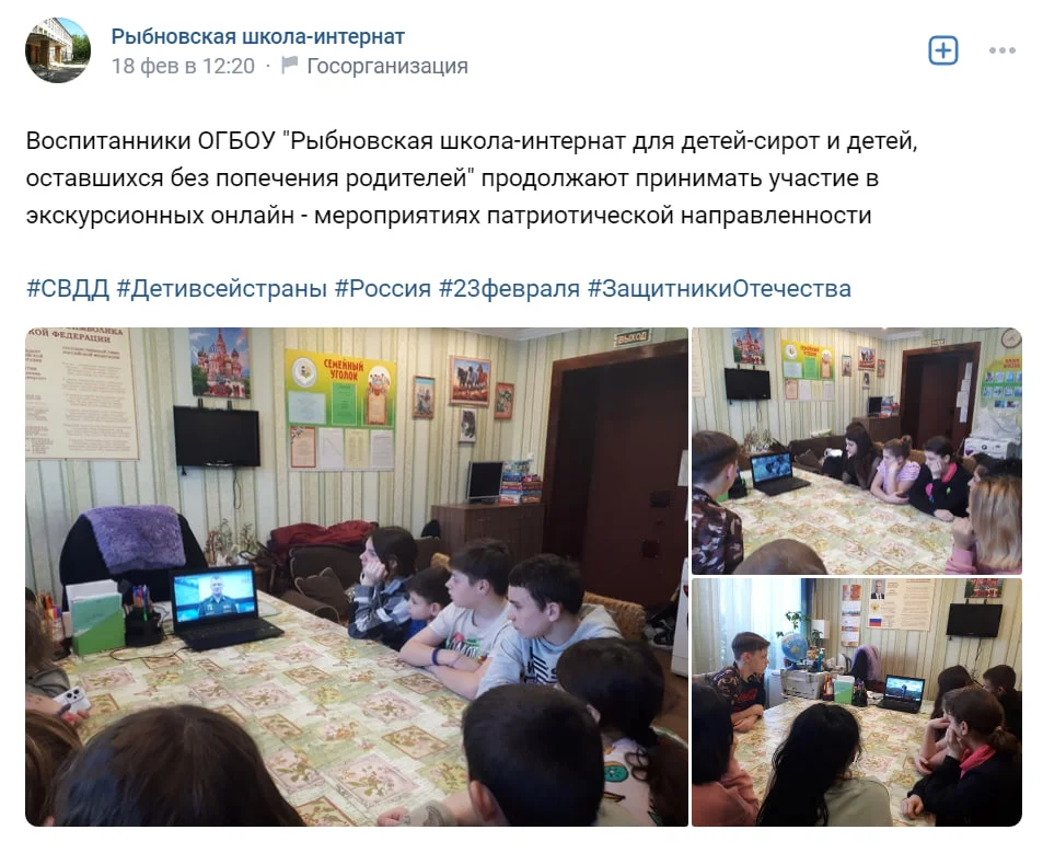 Журналисты изучили страницы учреждений и выяснили, что как минимум в 21 из них украинские дети совместно с российскими вынуждены участвовать в «патриотических мероприятиях». Например, слушать брифинги Минобороны РФ, в которых докладывают об «уничтоженных нацистах», делать окопные свечи, ставить военные спектакли, учиться обращаться с автоматом Калашникова, писать письма на фронт российским солдатам и посещать их в госпиталях.