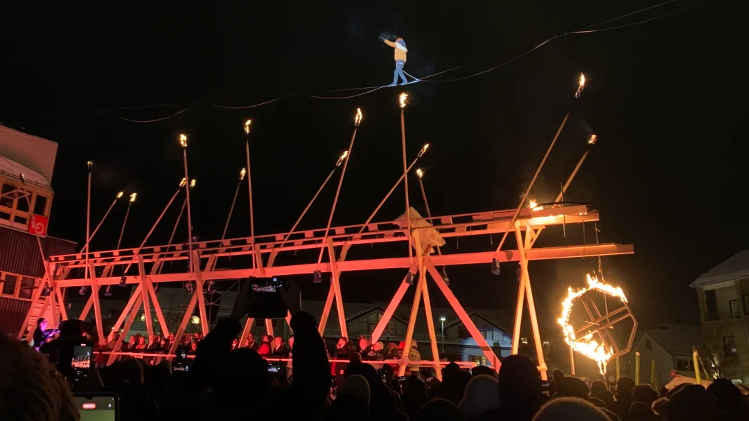 Чуть позже вечером на главной площади города откроют фестиваль. Это всегда уличное шоу. В этот раз художники выстроили из дерева мост, под которым на трибунах поместили хор. Часть хора была в костюмах, похожих на те, что носят российские чиновники. Часть — в норвежских свитерах. Пели тоже на двух языках разное государственно-воодушевляющее. А мост над хорами «чиновников» меж тем горел. Его подожгли два актера, стоявшие на разных краях. Мост пылал, «чиновники» невозмутимо пели. А тем временем по канату над площадью пытался пройти акробат. Срывался, чуть не падал, снова шел. Когда сжигают мосты, наш путь становится все более рискованным.
