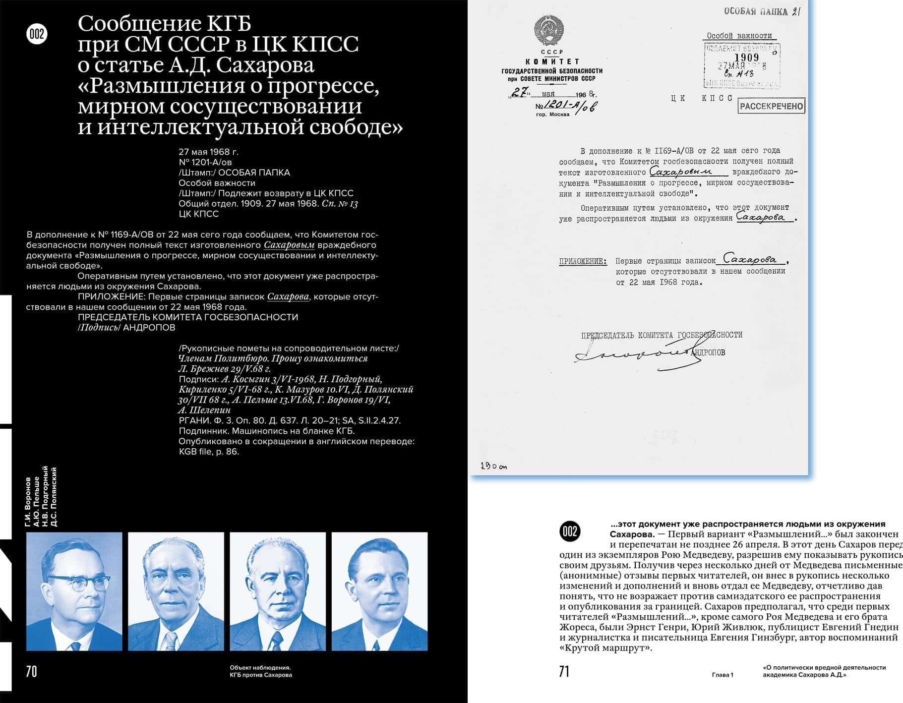 Все, вошедшие в сборник документы, в свое время были рассекречены, однако сейчас доступ к значительной части из них в архивах закрыт. Книга смогла состояться благодаря хранившимся все эти годы в правозащитных организациях копиям. Публикуемые материалы названы в книге "ядовитыми субстанциями пятидесятилетней давности". Это докладные записки, отчеты и справки, составленные наблюдавшими за Андреем Сахаровым сотрудниками КГБ. А еще – это стенограммы заседаний Политбюро и решения ЦК КПСС о пресечении деятельности правозащитника. Неусыпное внимание длилось более 20 лет, то есть в период с 1968 по 1989 год. И все же, по словам одного из составителей книги Анатолия Голубовского его обнадеживало погружение в историю советской репрессивной машины: