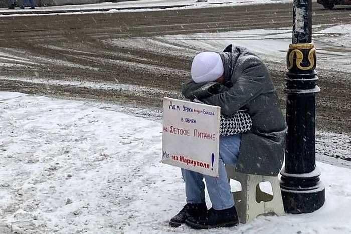 Зимой 2023 года на углу Моховой и Белинского в Петербурге появился мужчина — он часами сидел на морозе на раскладном стульчике с табличкой: «Дам уроки академического вокала в обмен на детское питание. Мы из Мариуполя!»