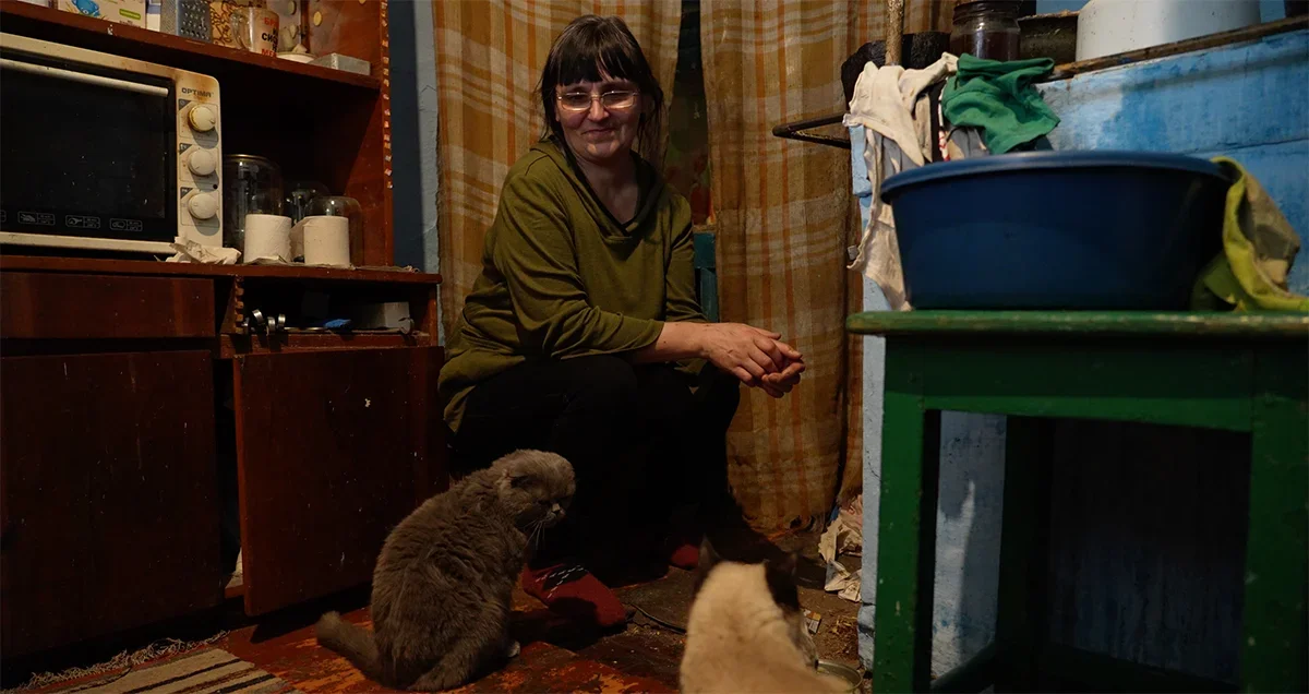 “I turn on flashlights in the evening so as not to waste electricity. I save both electricity and firewood. I wear three pairs of warm socks. If it gets very cold, I’ll look for another pair. There is chicken, coffee, bread — we live alright here,” she tells me convincingly. “Can I offer you something to eat?”