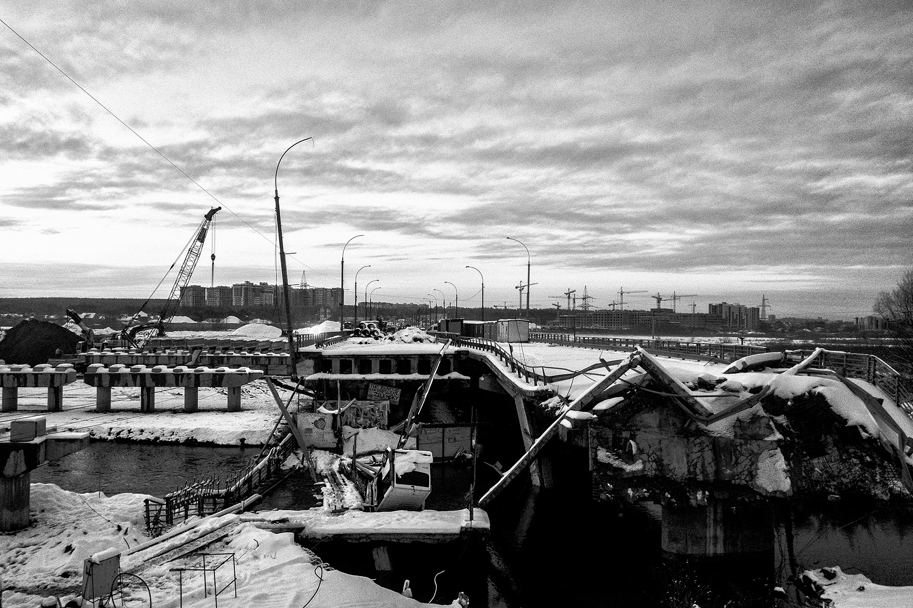 Мост теперь весь испещрен граффити. Люди пишут слова благодарности президенту Зеленскому. Вместо выстрелов — звуки машин и строек. Паника ушла из этих мест. Ирпенский мост, как и многие другие свидетельства вторжения, вполне мог бы стать памятником. Перевернутый микроавтобус, который я видел год назад, все еще здесь. На дорогах в Ирпене по-прежнему очень много разбитых машин — словно стоянка, где что-то пошло совсем не так. Когда я приехал, они были покрыты снегом. Вроде бы умиротворяющее зрелище, но было в нем что-то очень беспокойное. Я смотрел на машины и представлял себе, что случилось с людьми, которые на них ехали. Было понятно, что произошло страшное.