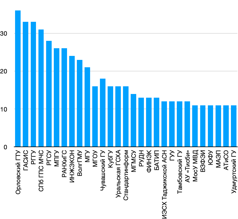 На диаграмме представлены основные вузы, в отношении которых выявлено наибольшее количество случаев диссертаций с манипуляциями. Подчеркнем, что количество выявленных работ, которые приводятся в данной диаграмме, зависит в том числе и от степени изученности данного вуза.