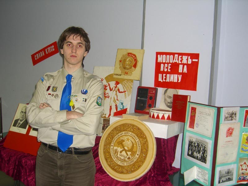 Николай Малуха на выставке молодежных организаций на фоне коммунистических символов