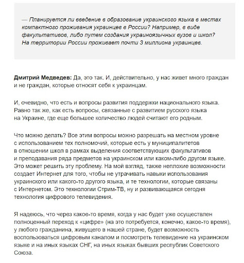 Мы тогда выдвинули вопрос в разделе образования: "А будут ли в России украинские школы?". Мы в своей категории заняли первое место и попали в двадцатку популярных вопросов, Медведев в прямом эфире ответил на этот вопрос.