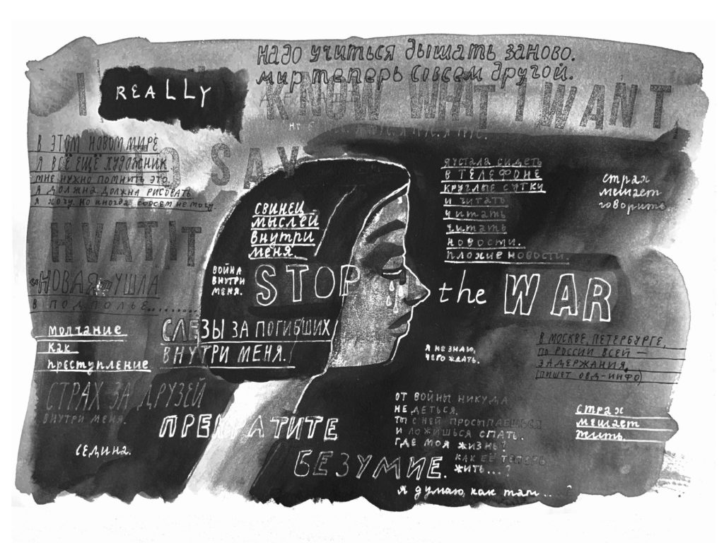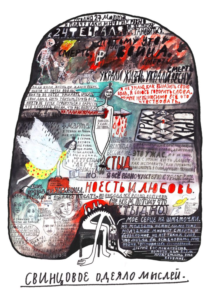 — Вы совершенно правы, аудитория этой выставки — люди, которые, скорее всего, разделяют нашу позицию и позиции авторов. Я не верю, что искусство может кого-то воспитать или перевоспитать. Я не верю, что человеку, поддерживающему войну, можно показать 150 антивоенных работ и он воскликнет: «О боже мой, куда же я раньше-то смотрел?!» Но при этом я как зритель (а чтобы говорить из другой позиции, у меня нет компетенций) глубоко убеждена, что искусство — это способ связываться с собственными эмоциями, взаимодействовать с ними, понимать их, легче их проживать и лучше с ними справляться. Я очень надеюсь, что в этом смысле наша выставка может быть для кого-то небесполезной.
