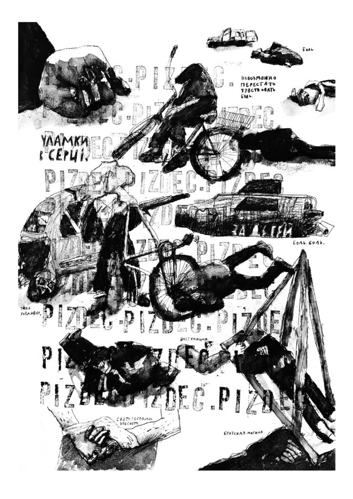 — Это наша первая выставка, но мы будем их делать каждые четыре-пять номеров ROAR. Механически принцип попадания работ на нынешнюю выставку был очень простым: это все работы, которые появились в первых четырех номерах журнала. Мы написали всем авторам, в географии от Украины до Аргентины. Один человек отказался из соображений безопасности, три автора не ответили, поэтому мы их не выставили, а всех остальных включили в экспозицию.