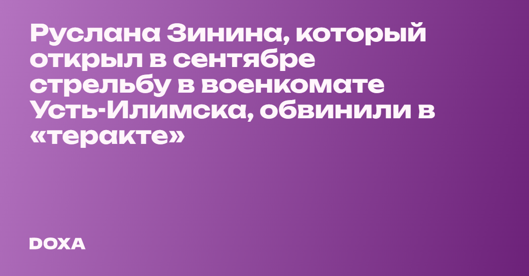Следствие переквалифицировало обвинение по делу о стрельбе в военкомате в Усть-Илимске против Руслана Зинина на совершение «террористического акта», сообщил правозащитный проект «Зона солидарности». Ранее Зинина преследовали за «посягательстве на жизнь сотрудника правоохранительных органов», несмотря на то, что военком, который был ранен во время стрельбы, им не является.