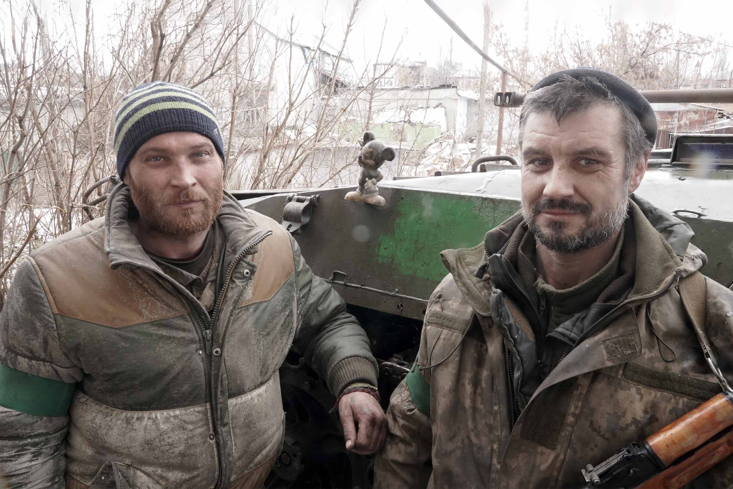 Полгода назад Андрей (слева) был сварщиком, Сергей (справа) — проводником поезда. Сейчас в Бахмуте в составе 93-й бригады ВСУ они без экипировки, без бронежилетов, без касок: две простые зимние куртки. Фото: Колян Пастыко / IWPR