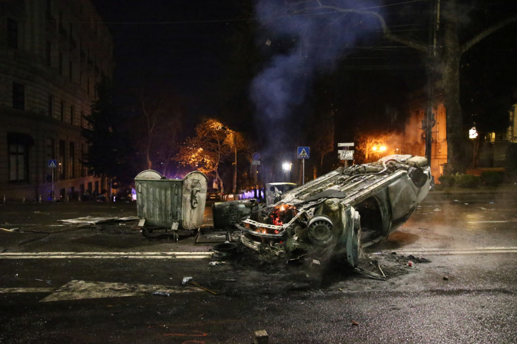В районе четырех утра на проспекте Руставели пару десятков протестующих перевернули полицейский автомобиль, ранее разрисованный граффити с членами. Затем все разбежались, а один из них поджег машину.
