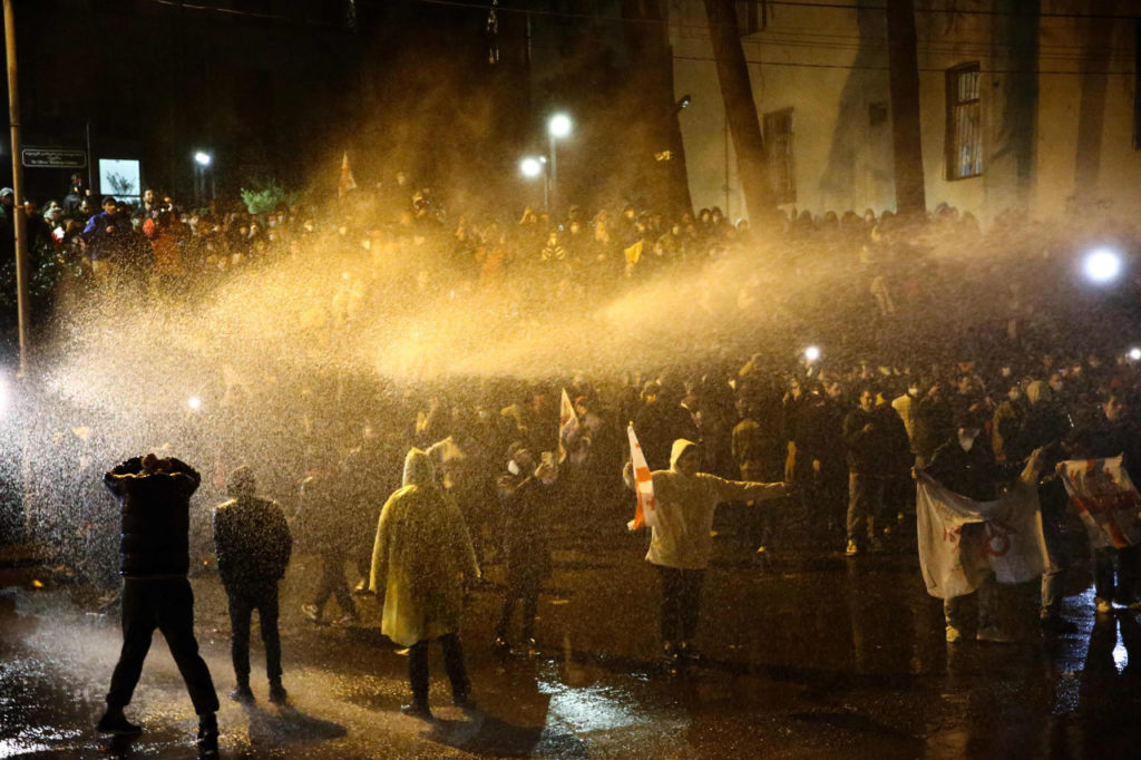 Примерно в то же время напротив здания парламента заметили мужчину в крови. Окружающие пытались ему помочь. Тысячи людей, кашляя от газа и временно теряя зрение, поднялись по главному проспекту города — Руставели. Отступая, протестующие забрасывали полицейских камнями, а потом принялись возводить подобие баррикад из лавочек и припаркованных у обочины электросамокатов.