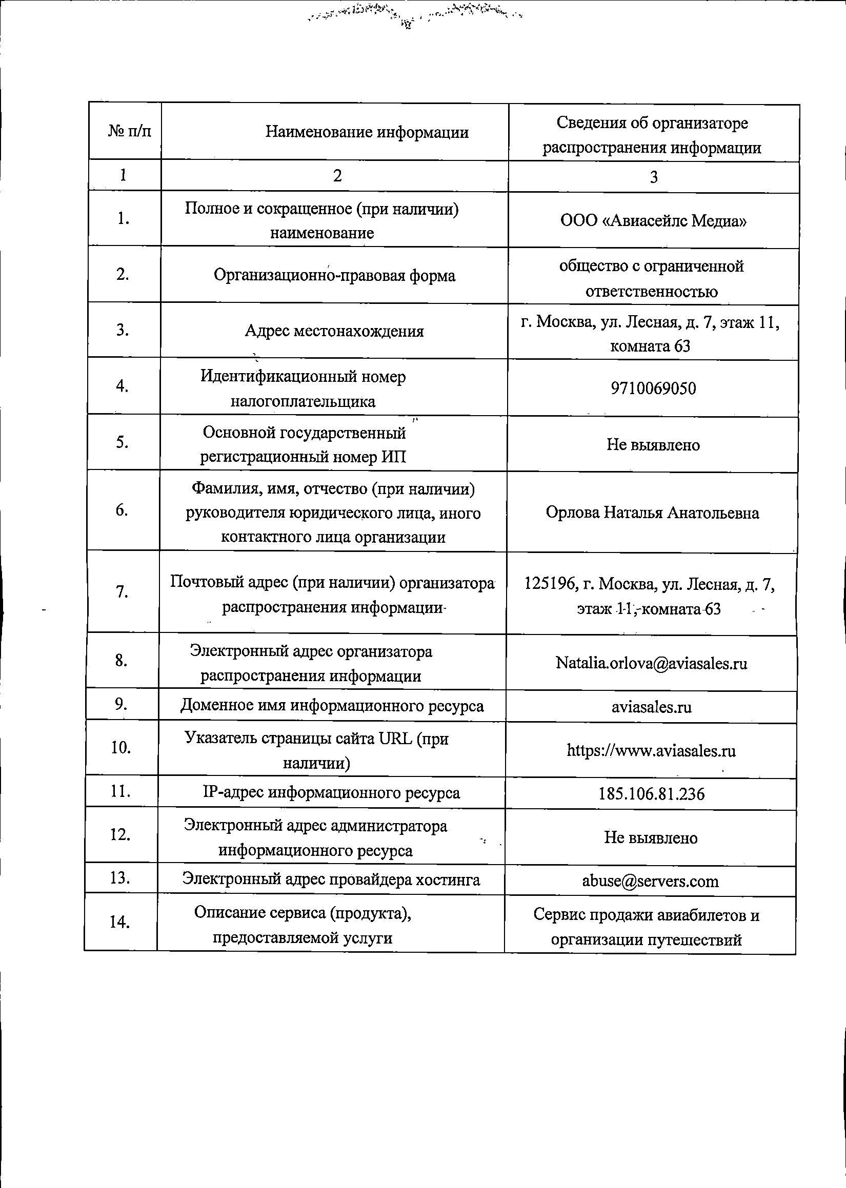 В соответствии с кодом ОКВЭД ООО «Авиасейлс Медиа» осуществляет деятельность по розничной торговле по почте или по информационно-коммуникационной сети «Интернет». Считаем целесообразным включение ООО «Авиасейлс Медиа» в реестр ОРИ.