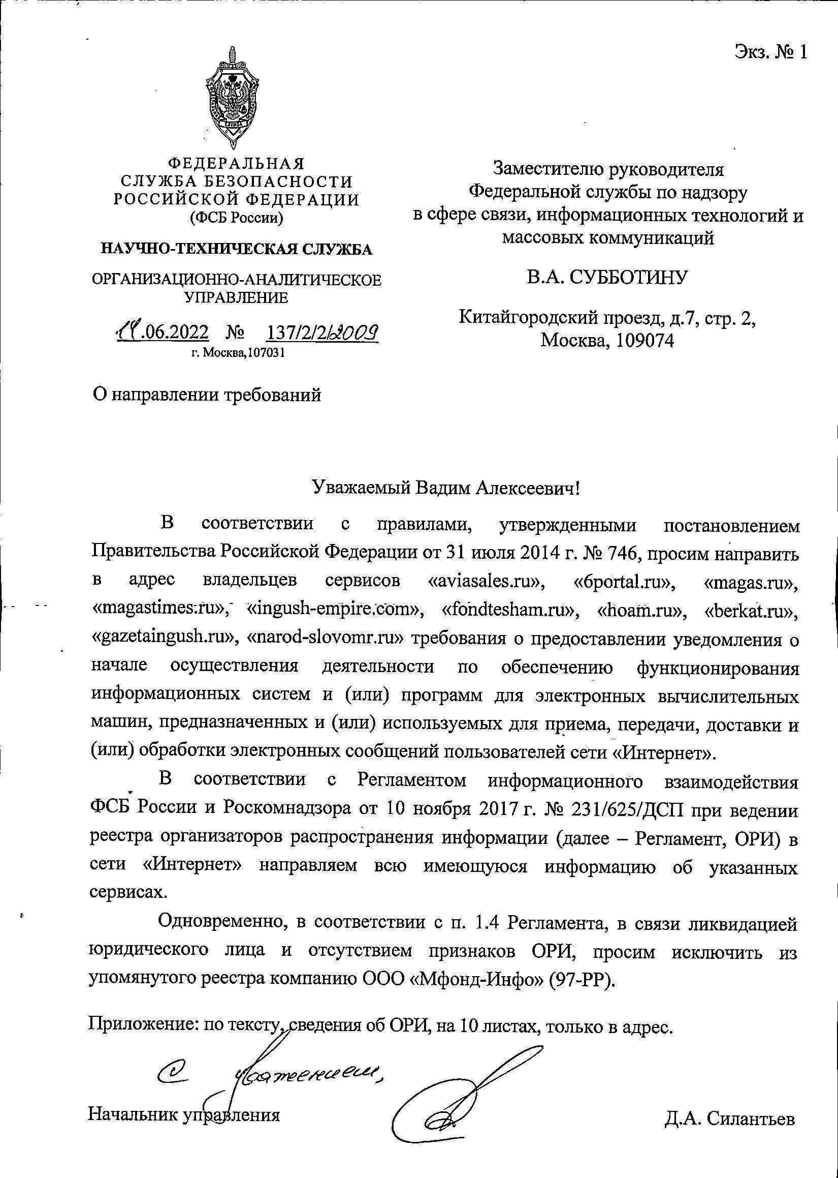 Начальник организационно-аналитического управления научно-технической службы ФСБ Дмитрий Силантьев 14 июня 2022 года обратился к заместителю руководителя Роскомнадзора (РКН) Вадиму Субботину. Он попросил направить владельцам десяти сайтов официальные требования, чтобы те зарегистрировались как «организаторы распространения информации» (ОРИ).