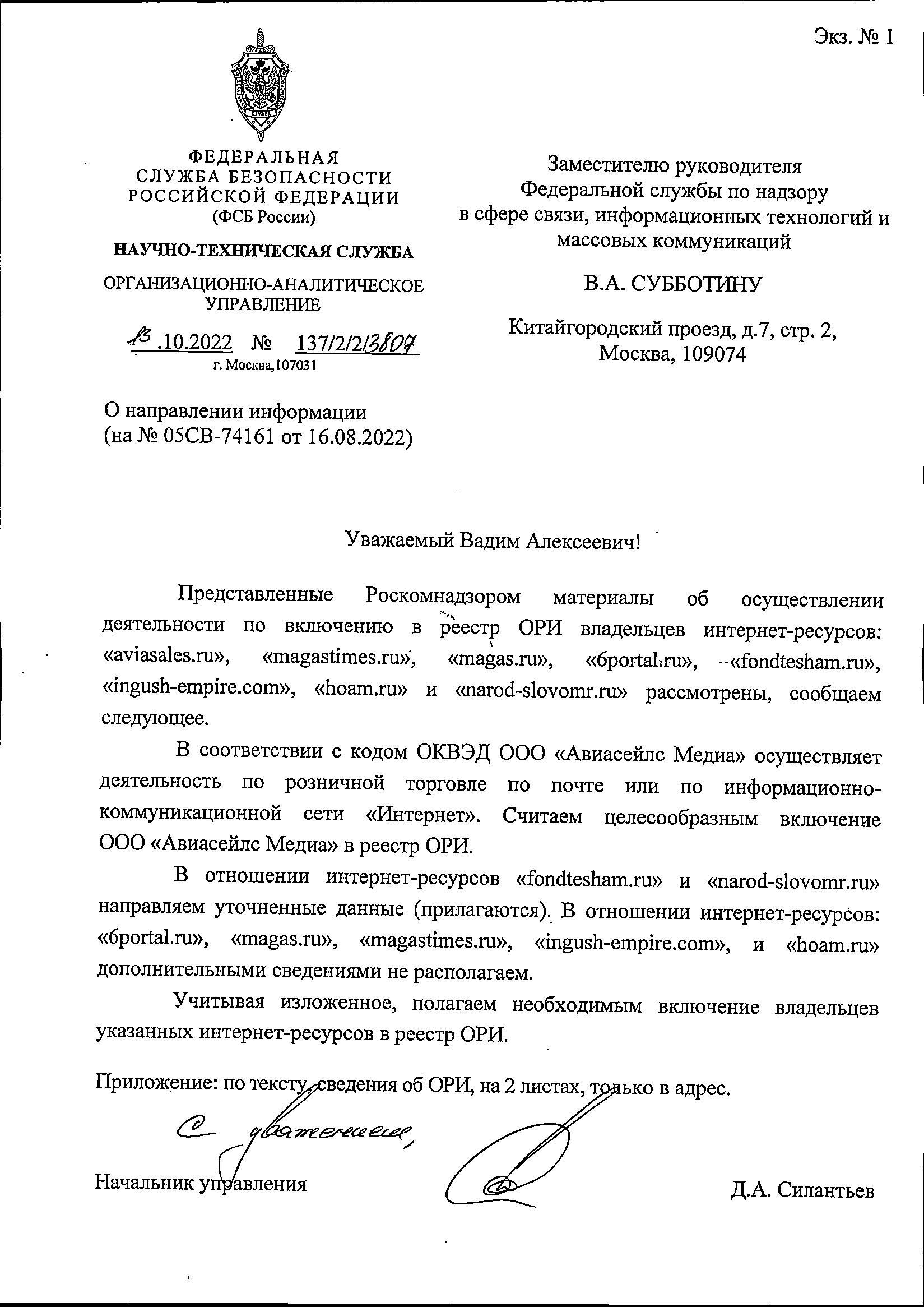 Поэтому Роскомнадзор спросил у спецслужбы о «целесообразности включения в реестр ОРИ» владельца aviasales.ru. 13 октября ФСБ ответила следующим образом:
